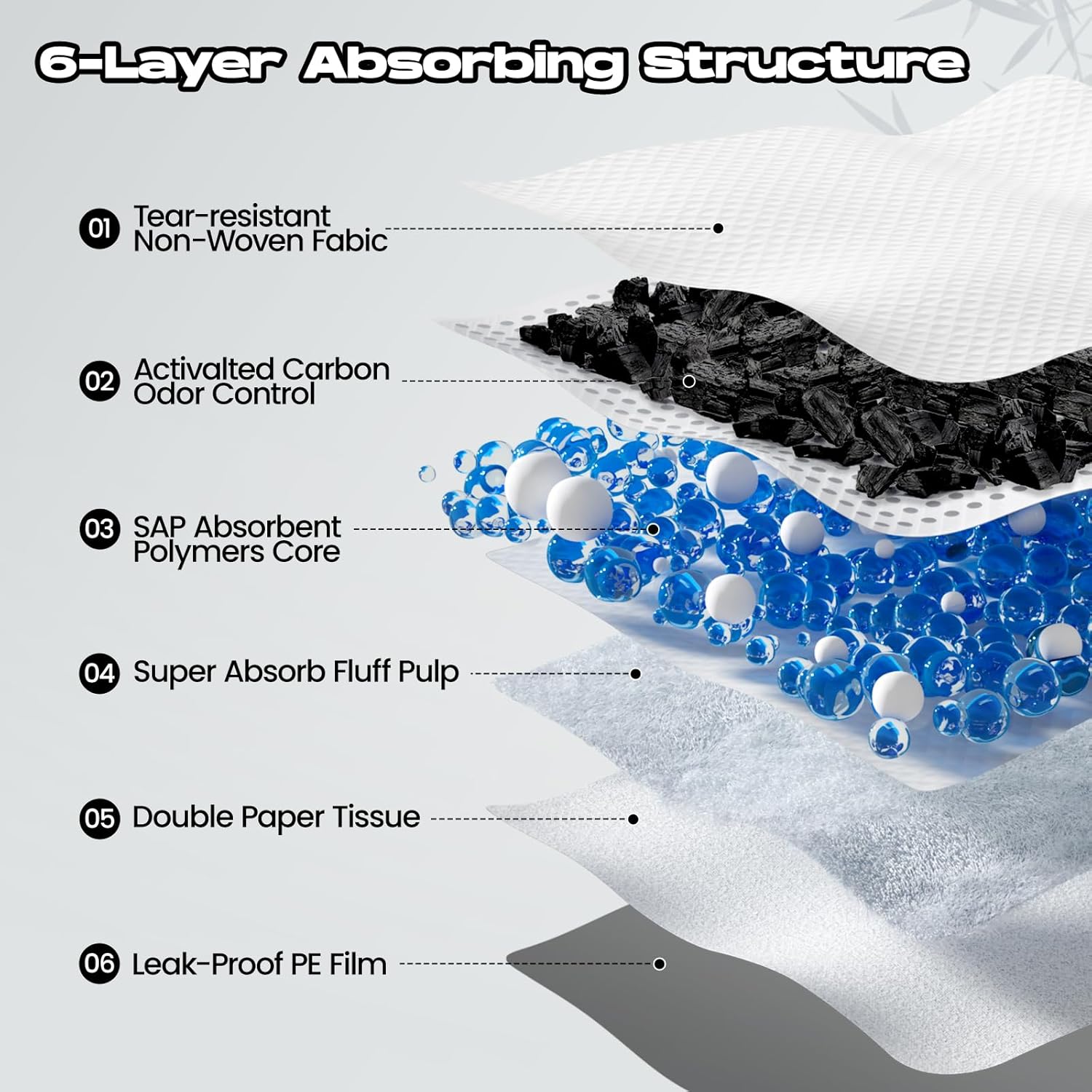 🦴【Super Absorbent & Quick Drying】6 layers of protection designed with polymers for super absorbency,converting liquid to gel in seconds for easy cleanup and staying dry.The non-woven fabric of the diaper pads accelerates liquid absorption and prevents reverse osmosis,keeping the surface dry quickly