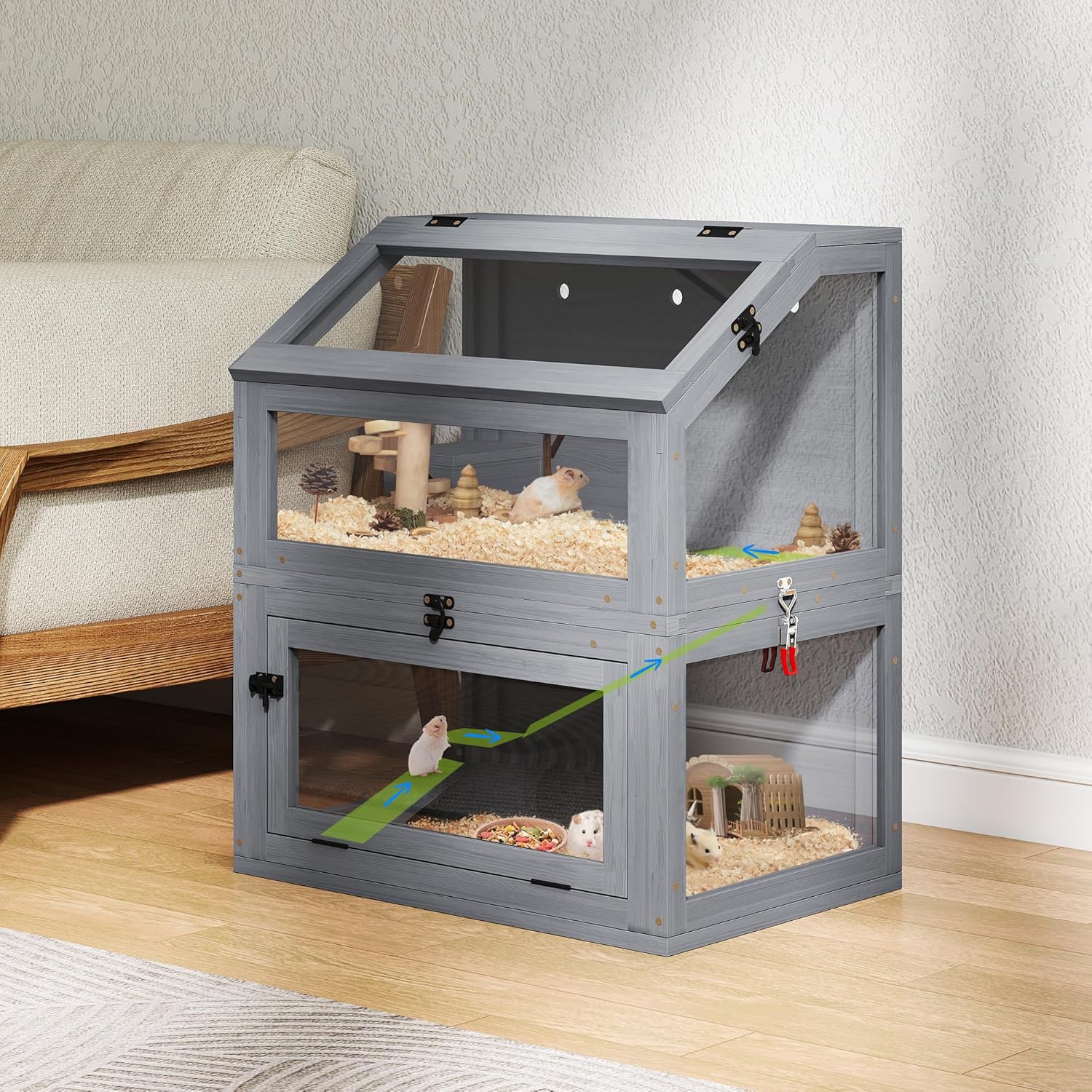 【Easy to Observe and Clean】Enjoy full views through the acrylic front and sides. The flip-down front door and escape-proof top hinged lid allow you to reach in for stress-free cleanups, fresh bedding, or a gentle head scratch.