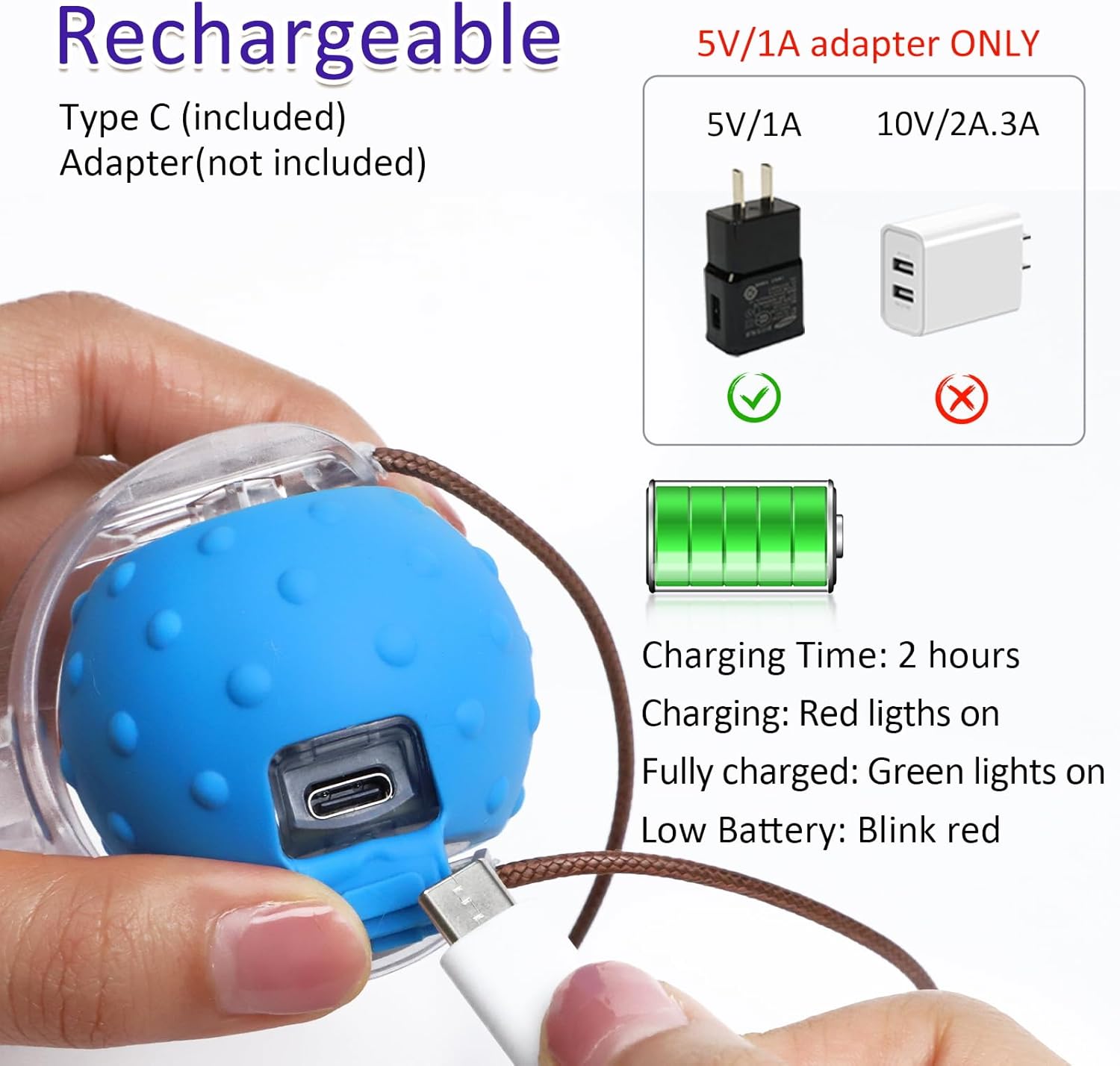 IMPORTANCE TIPS OF CHARGING – 5V/1A Adapter Only. Giociv cat ball works 5 minutes and goes into sleep mode if cats aren’t playing with it and wakes up once (after 2h) in while to see if they are now interested