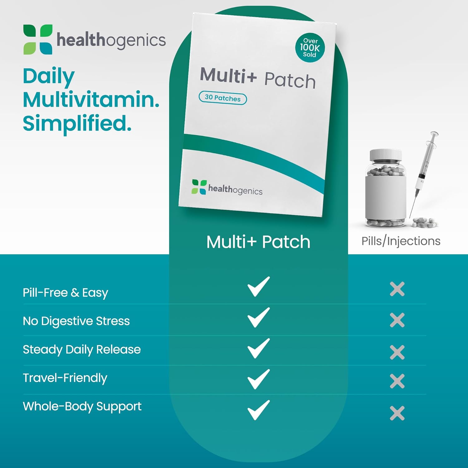 Simplified Multivitamin Support Healthogenics Multi+ Patch delivers a clean, doctor-designed blend of essential vitamins through your skin for steady daily nourishment. It supports energy, immunity, mental clarity, metabolism, and resilience without pills or powders ideal for busy or sensitive routines.