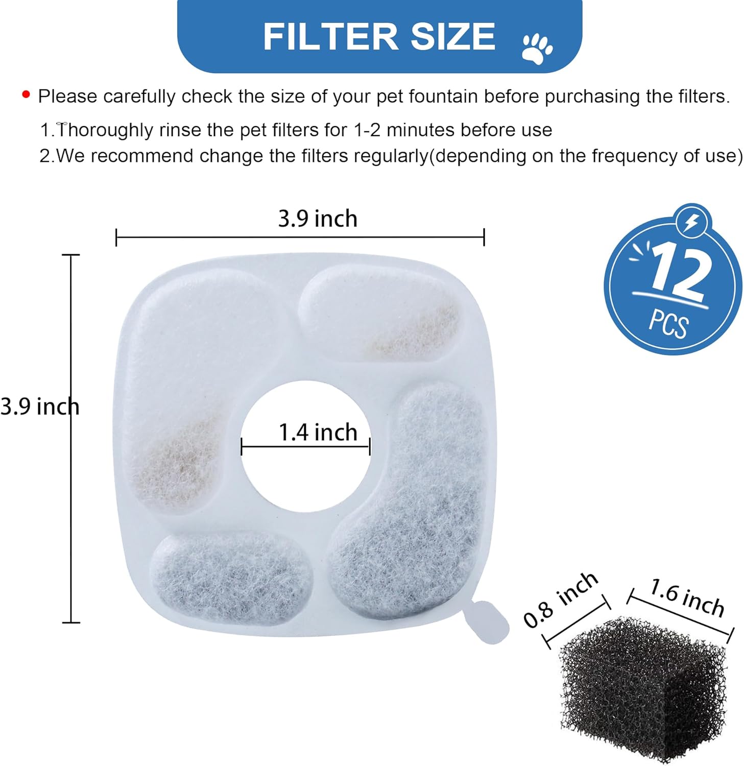 ▶【Wide Compatibility】– Cat water fountain filter fit fo Veken 95oz/2.8L Pet Fountain, please double check size before purchase. Diameter of hollow circle is about 1.4 inch.Length of square is about 3.9 inch.