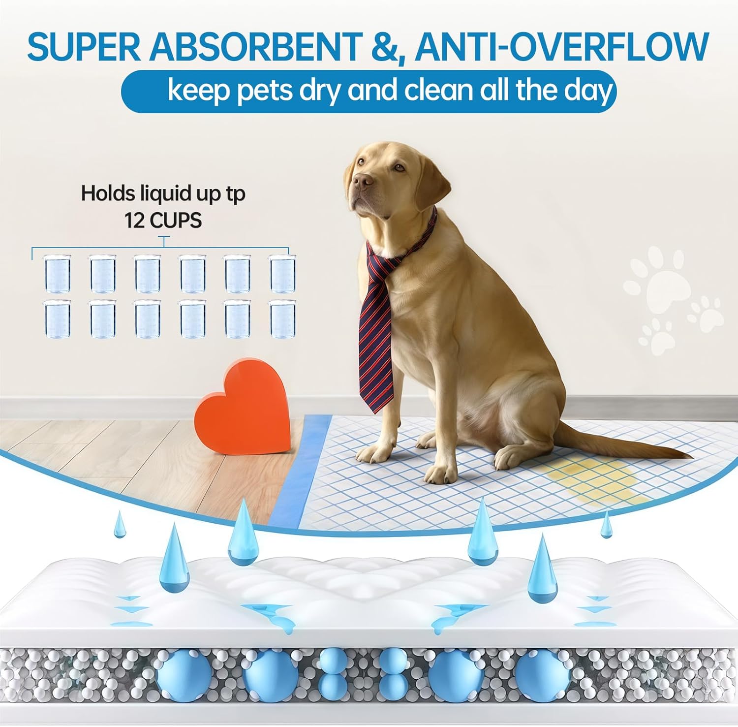 【Quick-Dry Surface】Wee wee pads for dogs top layer rapidly channels moisture away from the surface, keeping your pet’s paws clean and dry,The surface dries in seconds thanks to diamond-quilted channels,Diamond-quilted top layer distributes urine evenly and prevents overflow, reducing puddles and cleanup effort.Ideal As Housebreaking Supplies To Ensure A Dry Space While Protecting Floors From Spills With Leak-Resistant Edges