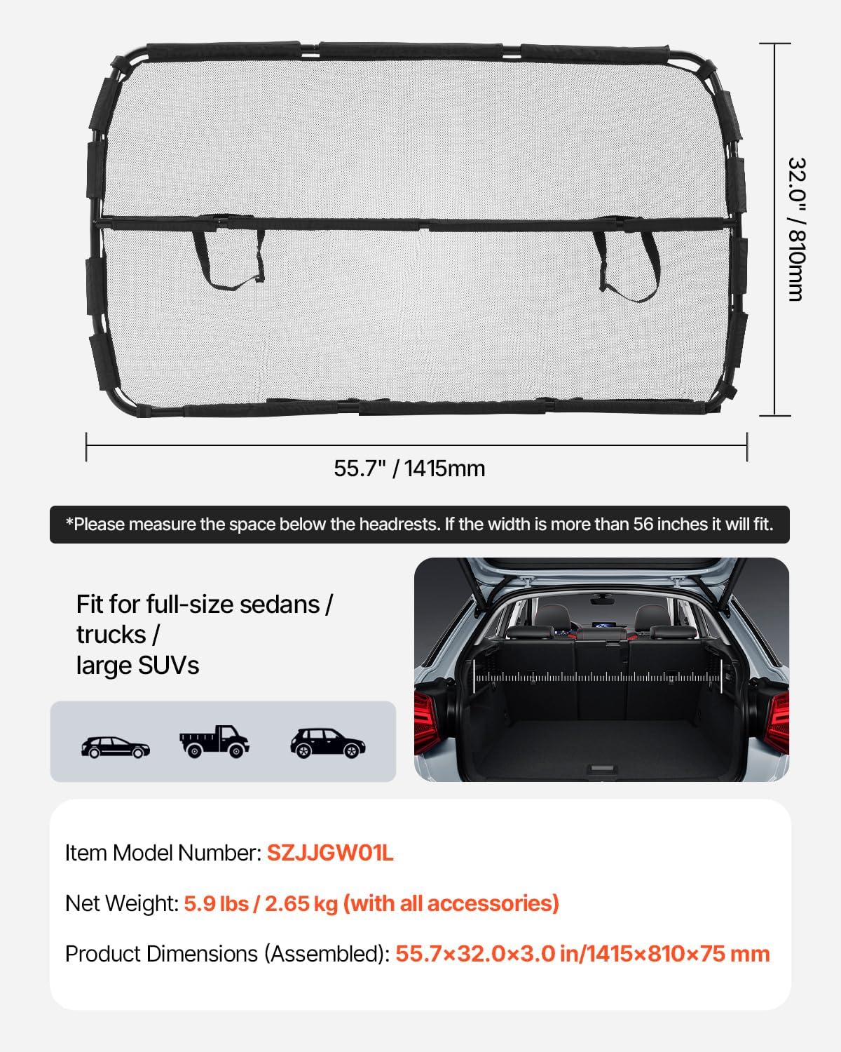 Size & Compatibility: The dog car barrier measures 56 x 32 inch(1422.4 x 812.8 mm), suitable for full-size sedans, trucks, and large SUVs. Please measure the distance behind the front seats: if the distance is less than 56 inches, this size is the right choice for you.